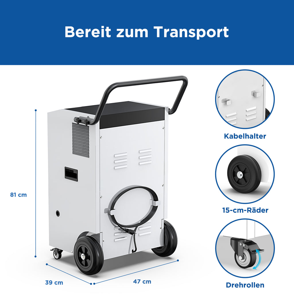 Schweres Gerät, leichte Arbeit: Mit den zwei großen 6-Zoll Rädern und dem praktischen Schiebegriff wird der Transport zur mühelosen Aufgabe. Ihr Schlüssel zu flexibler Entfeuchtung in jedem Winkel des Gebäudes.