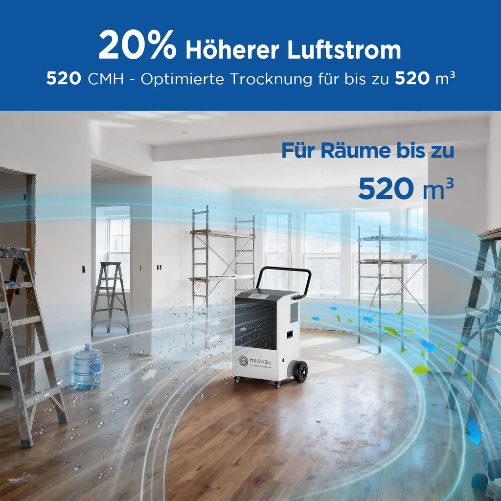 Optimierter Luftumsatz: 520 m³/h. Dieser Gewerbeentfeuchter trocknet Gebäudestrukturen schnell und gründlich.