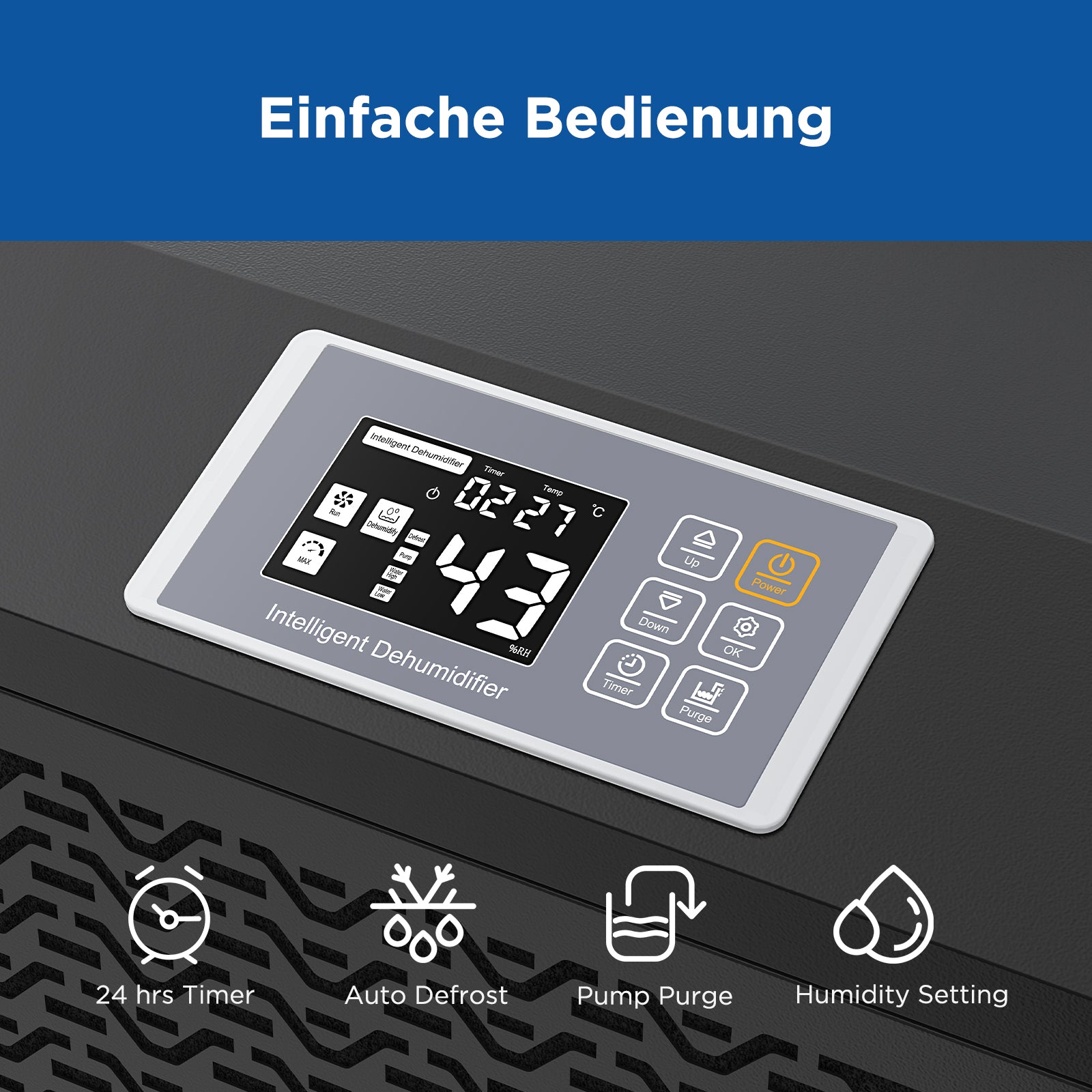 Stellen Sie den gewerblichen Luftentfeuchter mit Pumpe auf, wo es am praktischsten ist. Die integrierte Pumpe mit 5m Förderhöhe und 5m Schlauchlänge sorgt für uneingeschränkte Aufstellmöglichkeiten und wartungsfreien Betrieb.