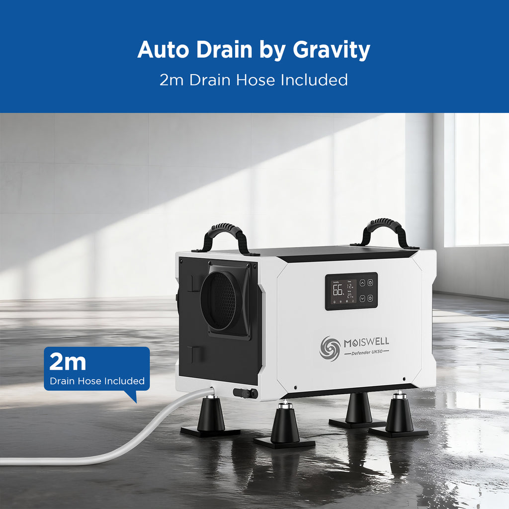 Compact Design – The Moiswell crawl space dehumidifier combines a small footprint with strong performance, delivering 350 CMH airflow and removing up to 75 litres per day (50 L/day at 30°C, 80% RH) to control humidity effectively.